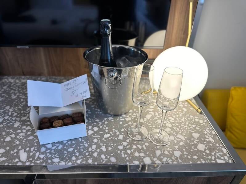 After the photoshoot, we checked into our next hotel, the Pullman Paris Montparnasse. Upon learning about our anniversary, the hotel staff went above and beyond, checking us in early and upgrading our room. The hotel itself was stunning, with a modern and efficient elevator system that ensured no waiting. As we entered our room, we were delighted to find a bottle of champagne on ice, ready to celebrate. The room was simply amazing, with a fabulous view that made our stay even more memorable. After a champagne-soaked morning without breakfast, our stomachs were craving something quintessentially American. Luckily, the hotel's Umami restaurant delivered a truly satisfying lunch.
