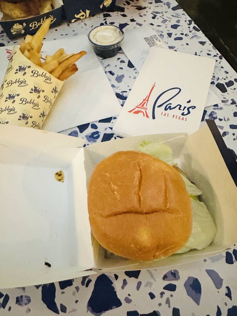 After checking in and dropping our bags, we wasted no time getting into the Vegas spirit! We hopped on the shuttle and headed straight for lunch and some sightseeing—after all, there’s no time to waste in this city! The shuttle dropped us off right at the Paris Las Vegas Hotel, where we took a quick tour of the iconic property, snapping pictures of the stunning Eiffel Tower replica. After soaking in the sights, we were ready to refuel, so we made a pit stop at Bobby’s Burgers by Bobby Flay. And let me tell you—those burgers and fries? Absolute perfection! They were juicy, flavorful, and exactly what we needed to power through the rest of the day.